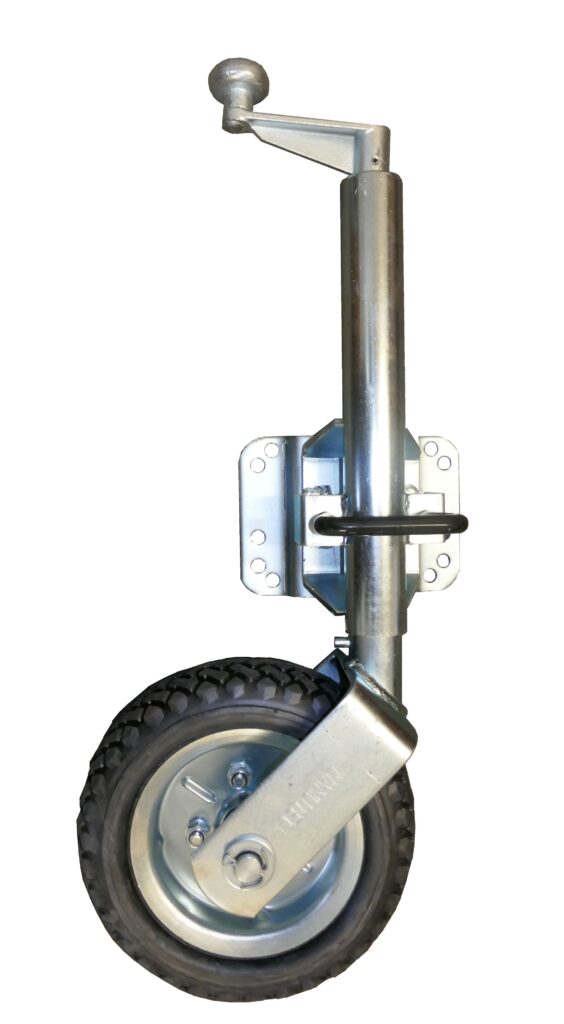 The AL01352 premium jockey wheel offers increased capacity with a heavy duty locking pin swivel bracket, heavy duty winding handle and thrust bearing and a 4.10/3.50×4 (10″) “Pneumatic Look” solid cushion tyre with a zinc plated steel centre and bronze bush bore.